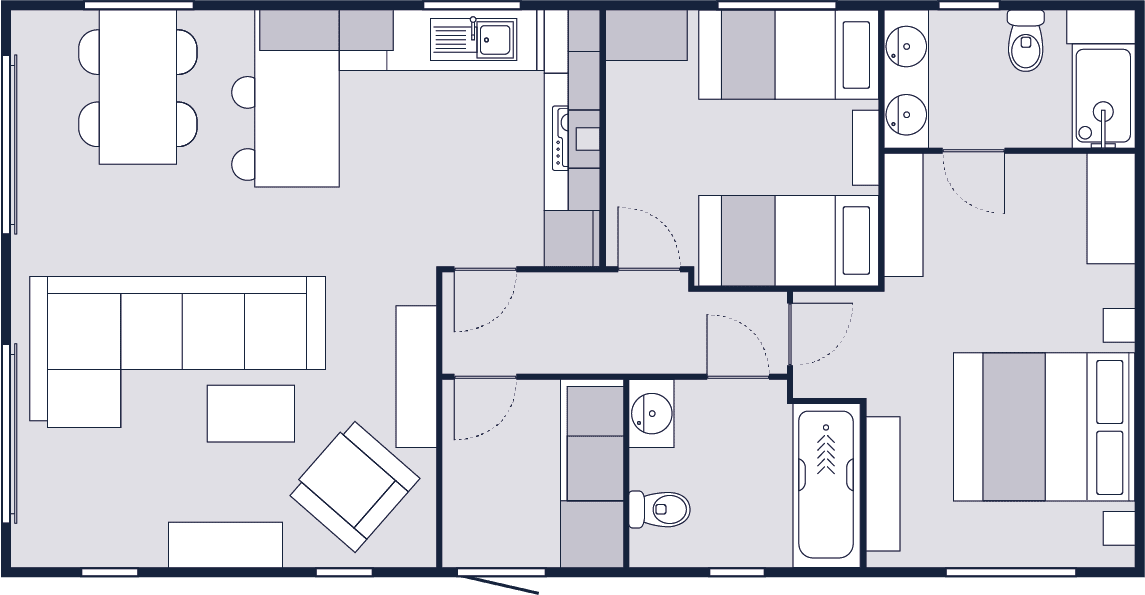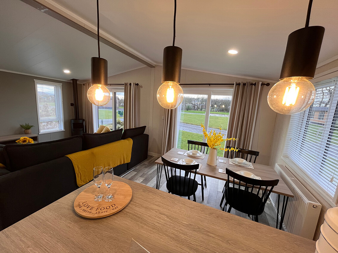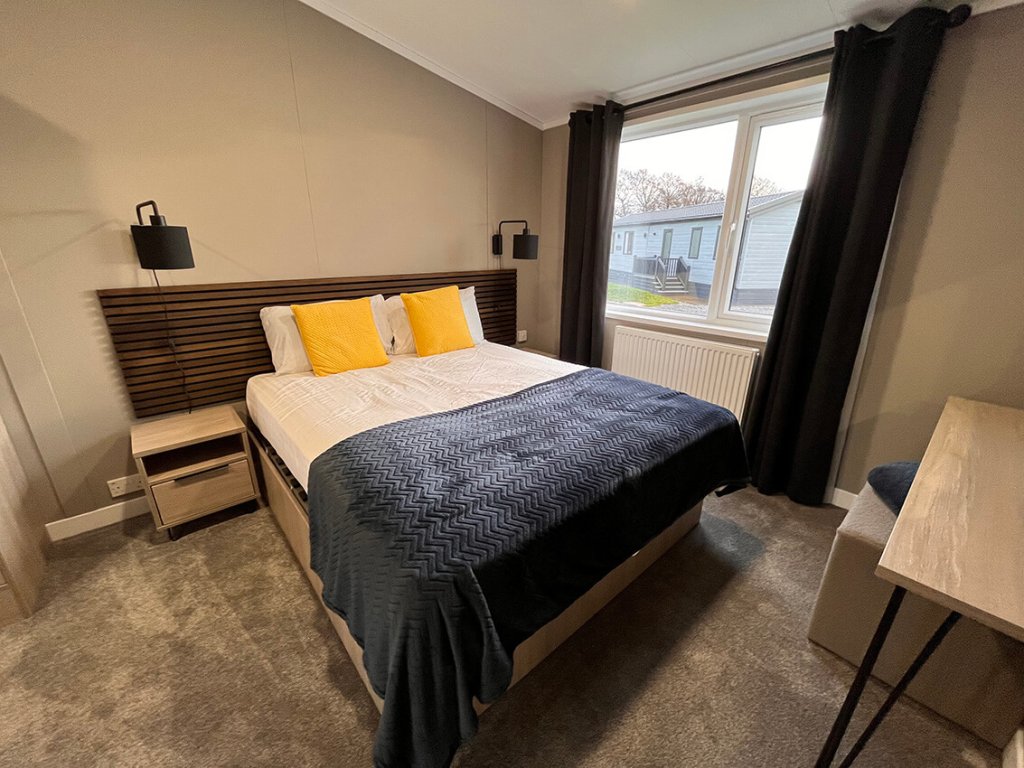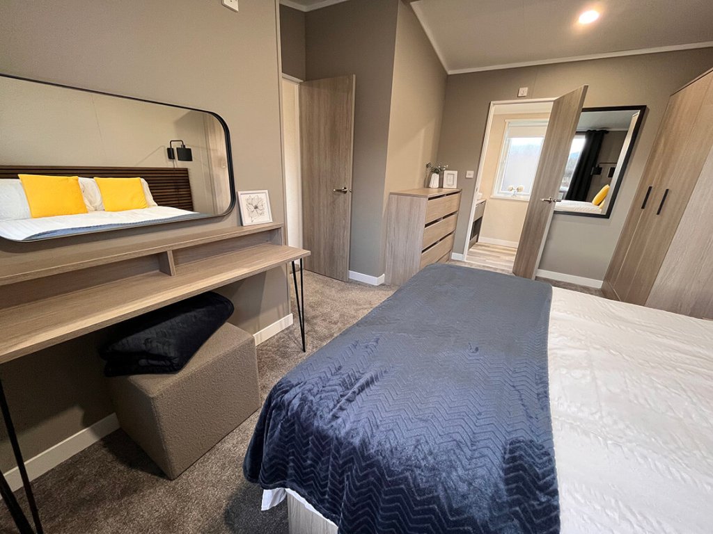 Modern with calming, warm furnishings and textures throughout, the Faraday Lodge offers styleand comfort at its finest. The lounge has a calming and serene atmosphere, with a neutral palette of muted mushroom and calming creams. Inspired by high-end Scandinavian design, the upholstery is a soft black fabric to add warmth. Boucle and woven scatter cushions give a sense of luxury and texture along with the freestanding teddy-fabric chair, and the muted striped curtains to add depth and pattern